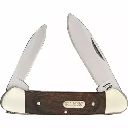 - Brown rich grain wood handles with nickel silver bolsters and Buck logo inlay shield