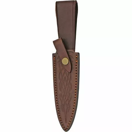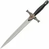 Model – DM1236BK. Twisted Horn Dagger. 10.5 inch overall. 6 inch double edge Damascus steel dagger blade. Sculpted horn handle. Brass guard and pommel. Black and brass spacers. Brown leather belt sheath. Boxed.