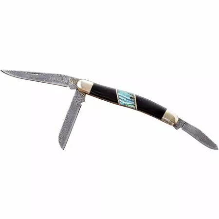 - Faux damascus finish stainless clip, sheepsfoot, and spey blades