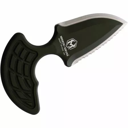 Model/Part Number – H0502CGRN. Heretic Sleight Push Dagger. 5.5″ (13.97cm) overall. 3″ (7.62cm) green serrated CPM-20CV stainless blade. Green aluminum handle. Detachable double edge blade. Sheath compatible with all Sleight models. Black Kydex belt sheath. Boxed. Made in USA.