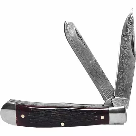 Model – RP0002DRB. Roper 0002DRB – Tombstone Trapper. 4.13″ (10.49cm) closed. Damascus steel clip and spey blades. Red jigged bone handle. Stainless bolster(s). Inlay shield. Boxed. Made in China.