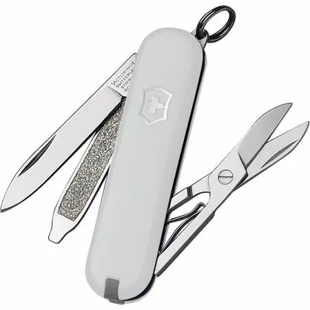 - All feature blade; nail file with screwdriver tip; scissors; toothpick; tweezers and keyring