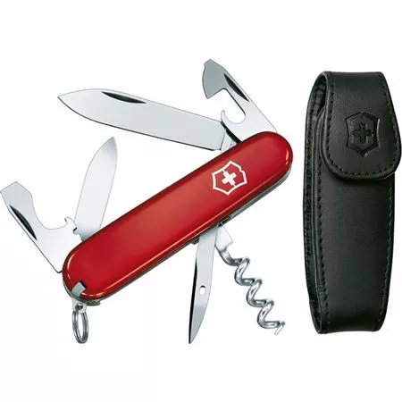 - Features large blade; small blade; corkscrew; can opener with small screwdriver; bottle opener with screwdriver and wire stripper; reamer with sewing eye; toothpick; tweezers and keyring