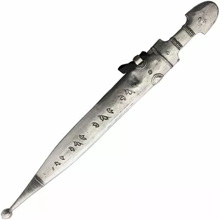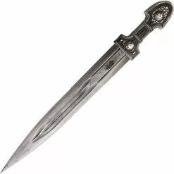 Model/Part Number – VTD0055X. VT Daggers Caucasian Dagger Forged Steel. 17″ (43.18cm) overall. 12.5″ (31.75cm) double edge steel dagger blade. Silver plate handle and scabbard. There is a small dent in the scabbard. Bulk packed. Made in Georgia.